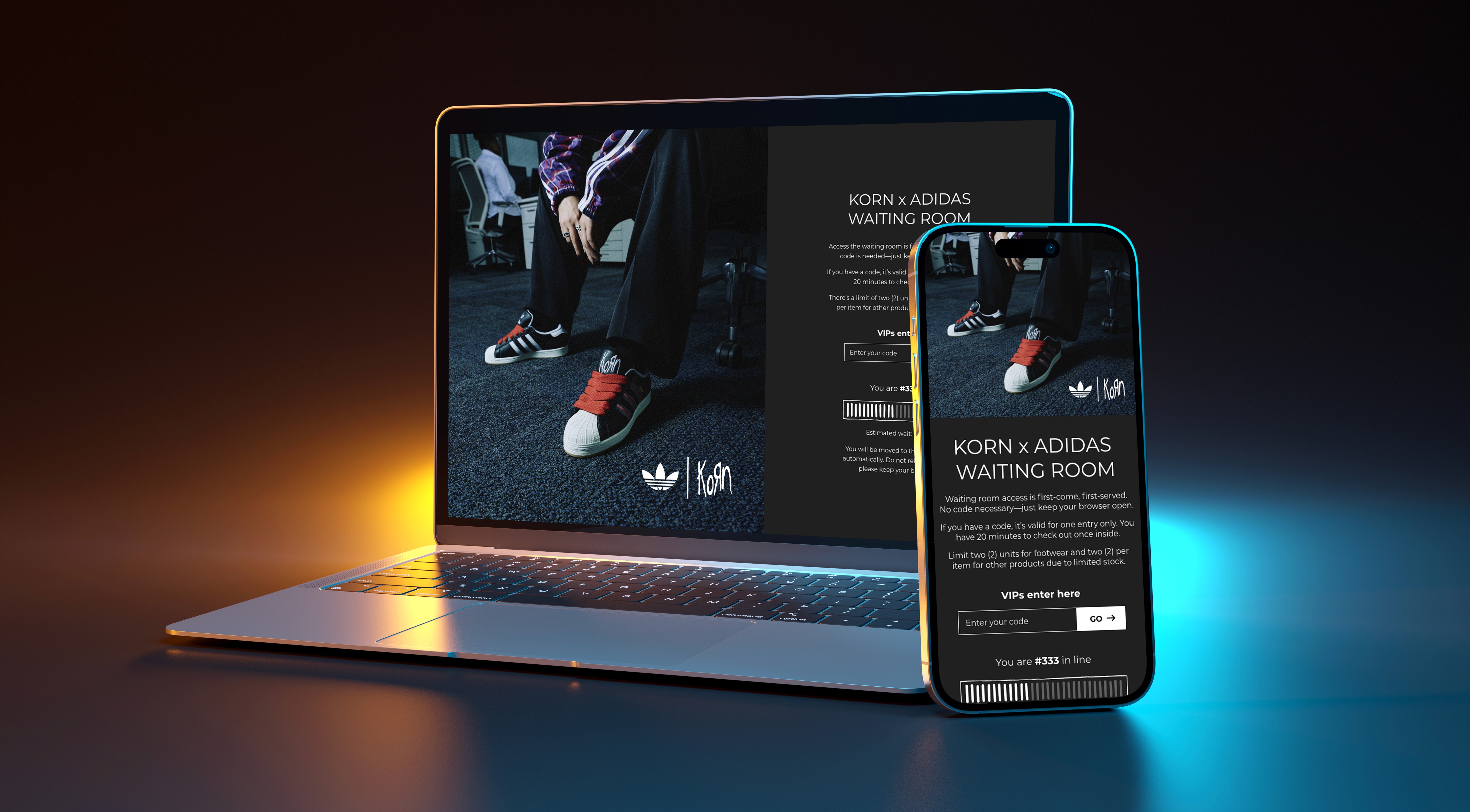 Korn’s collab with Adidas meant serious hype — and serious risk of bots and resellers flooding the system. We needed a digital waiting room and queue interface that could adapt to multiple states (pre-queue, active queue, sold out, VIP access), while aligning with both Korn’s creative vision and Adidas’s strict brand standards.